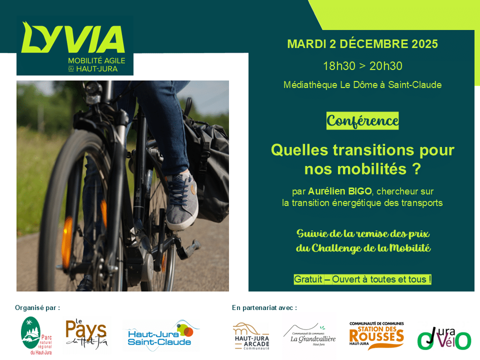 Une conférence proposée par Aurélien BIGO, chercheur sur la transition énergétique des transports. Elle sera suivi de la remise des prix du challenge mobilité Bourgogne Franche-Comté.
